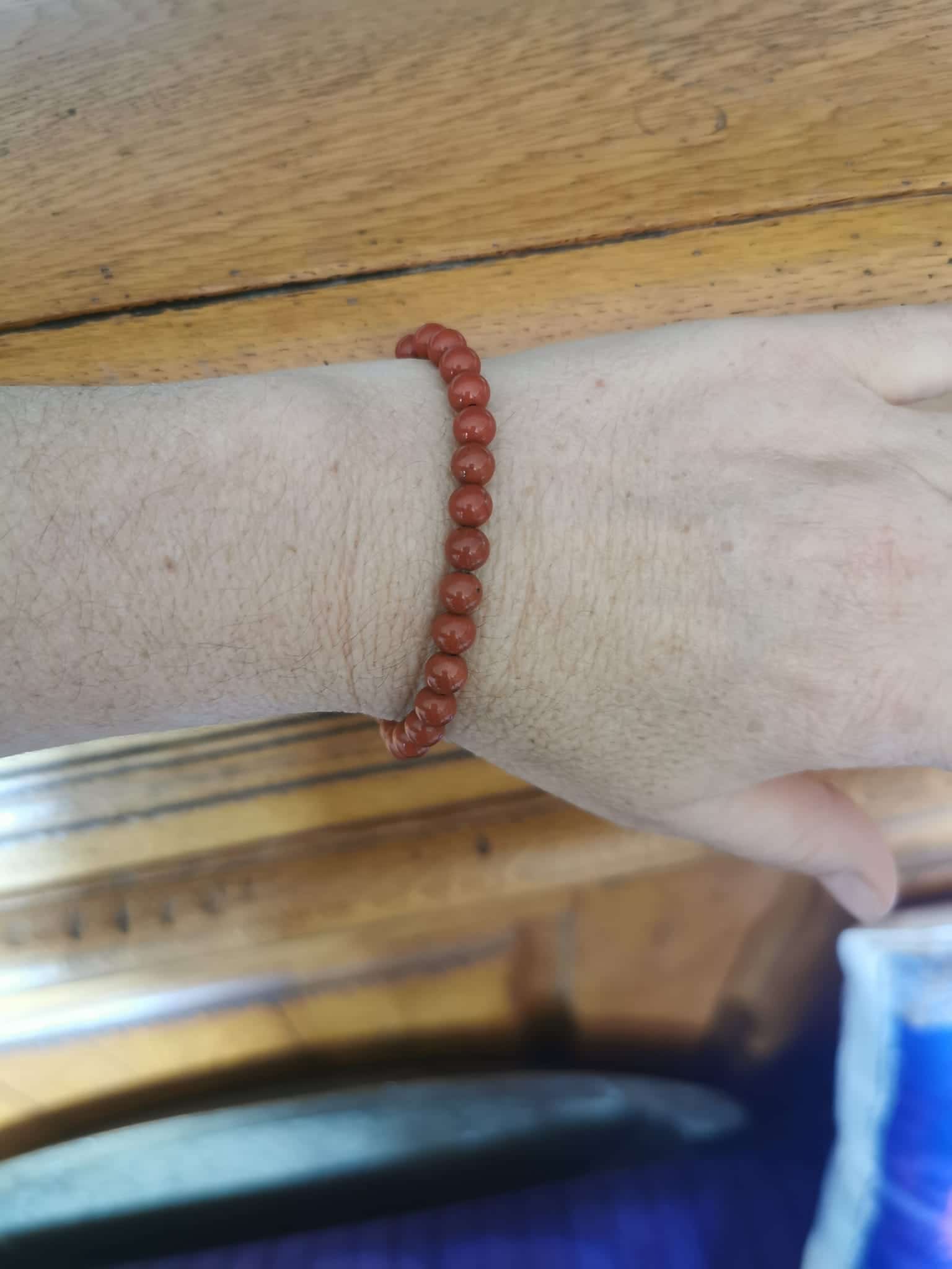 Perles en Jaspe Rouge naturel de 6 mm (C’est le deuxième en partant des mains sur la photo avec plusieurs bracelets)