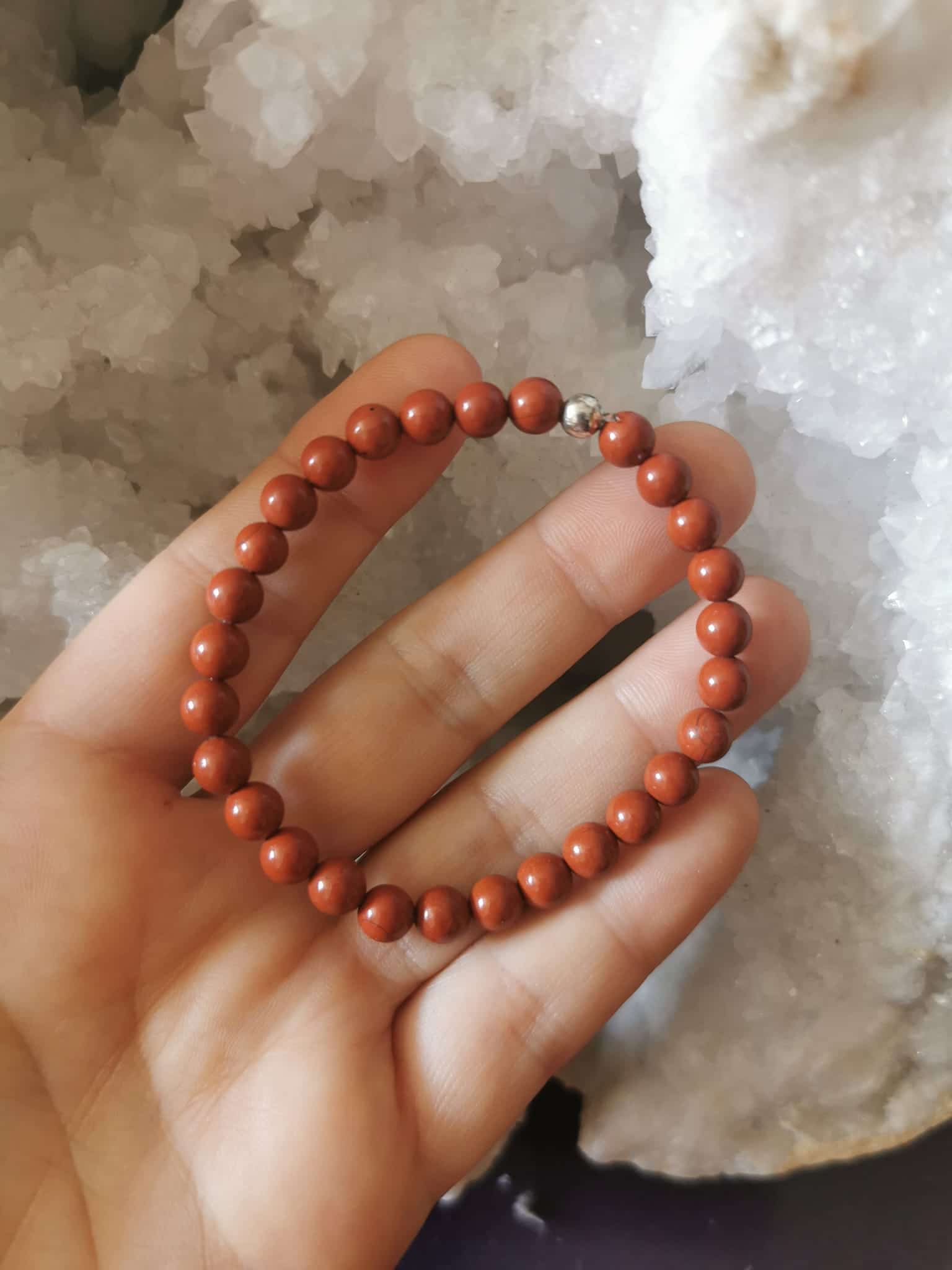 Perles en Jaspe Rouge naturel de 8 mm (C’est celui du milieu sur la photo avec plusieurs bracelets)