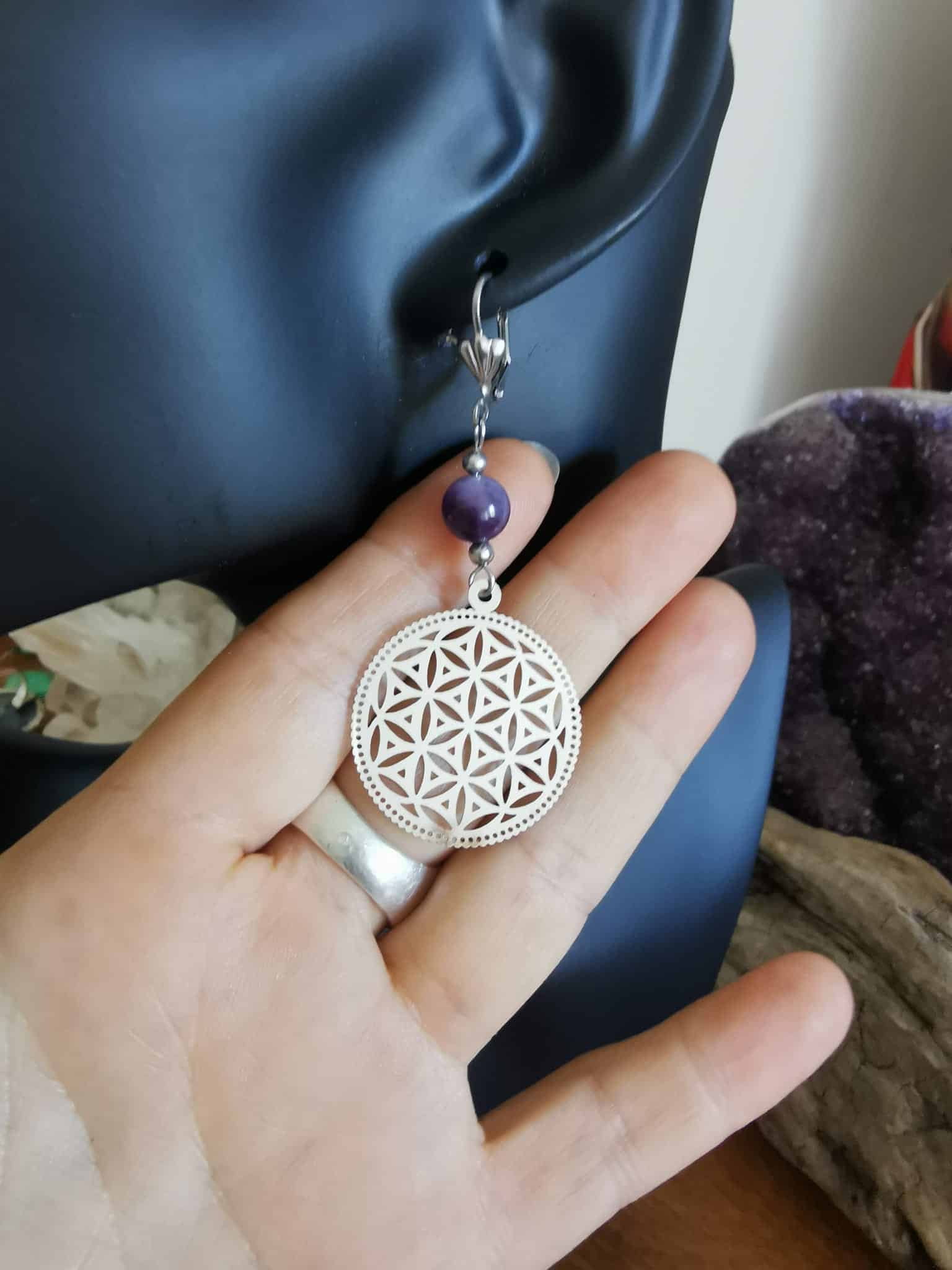Boucles d’oreilles Améthyste et Fleur de Vie