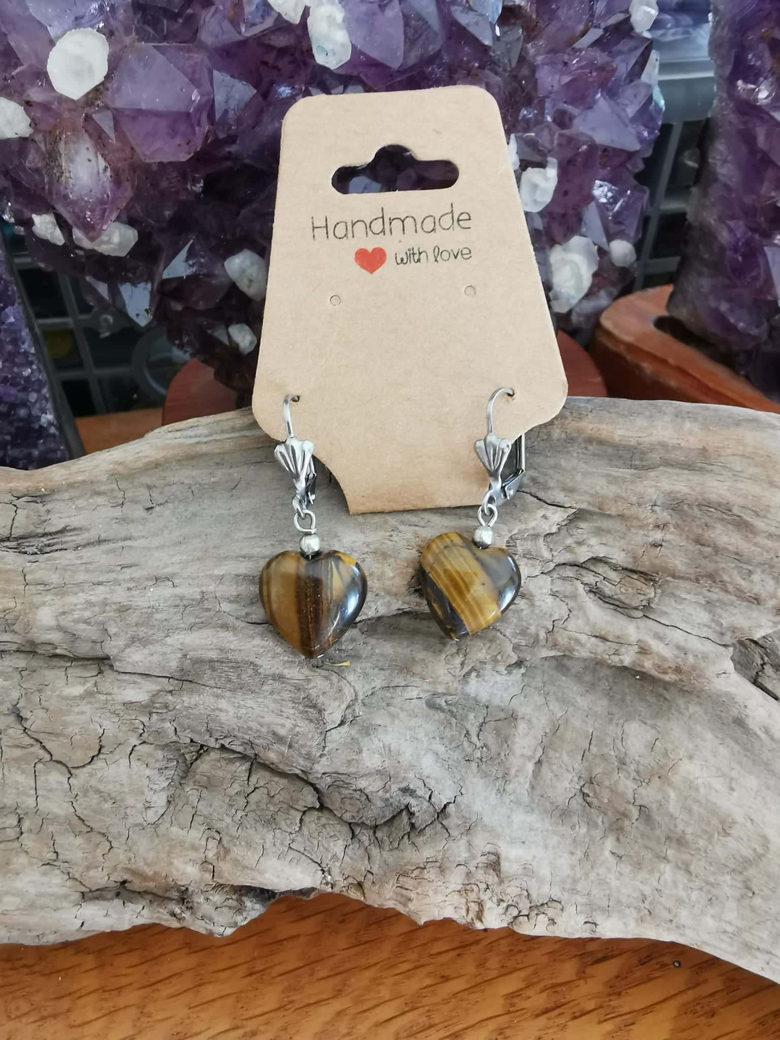 Petits Cœurs  de Protection ,en Œil de Tigre ,montés sur des Dormeuses en Acier inoxydable .