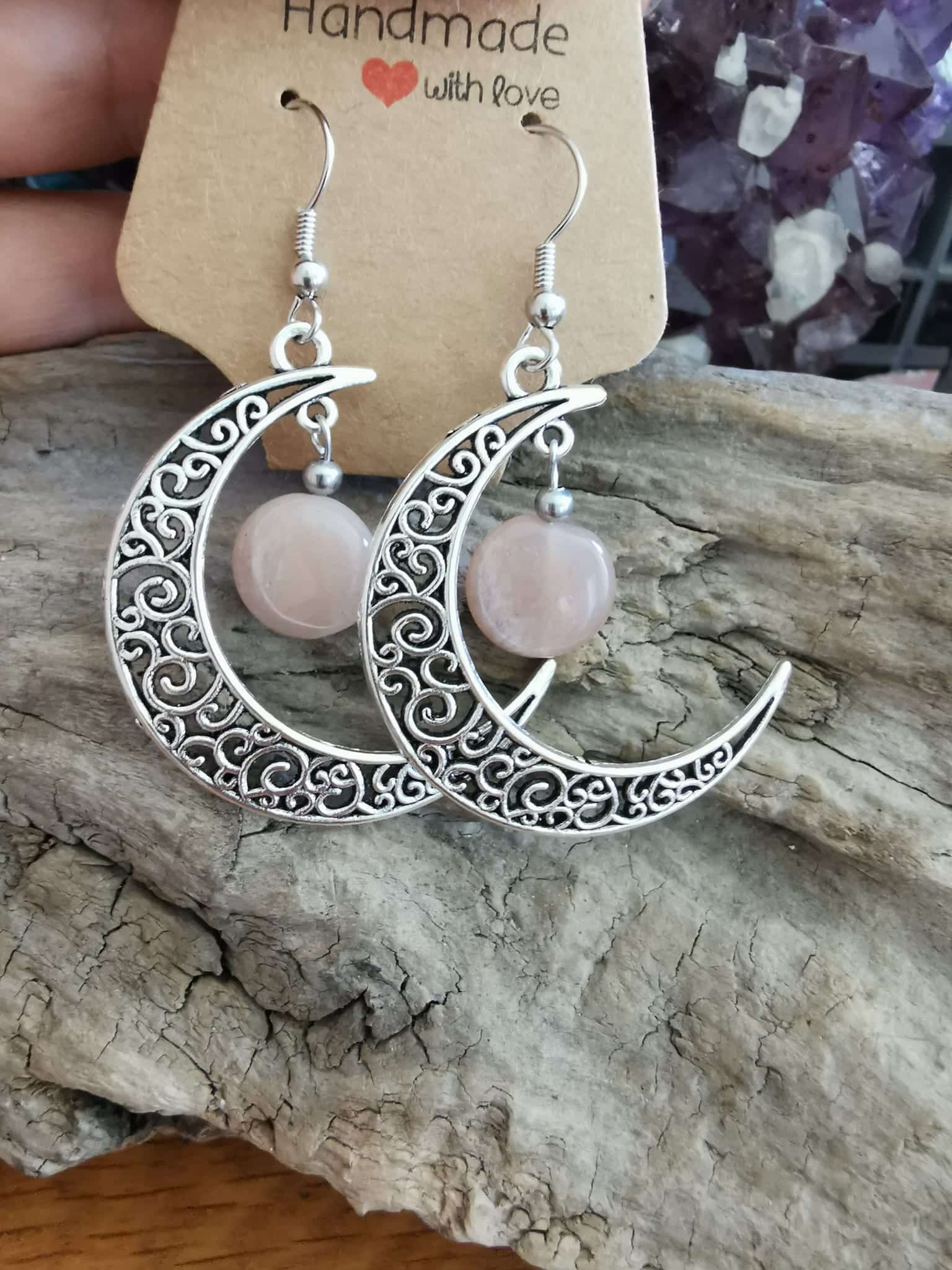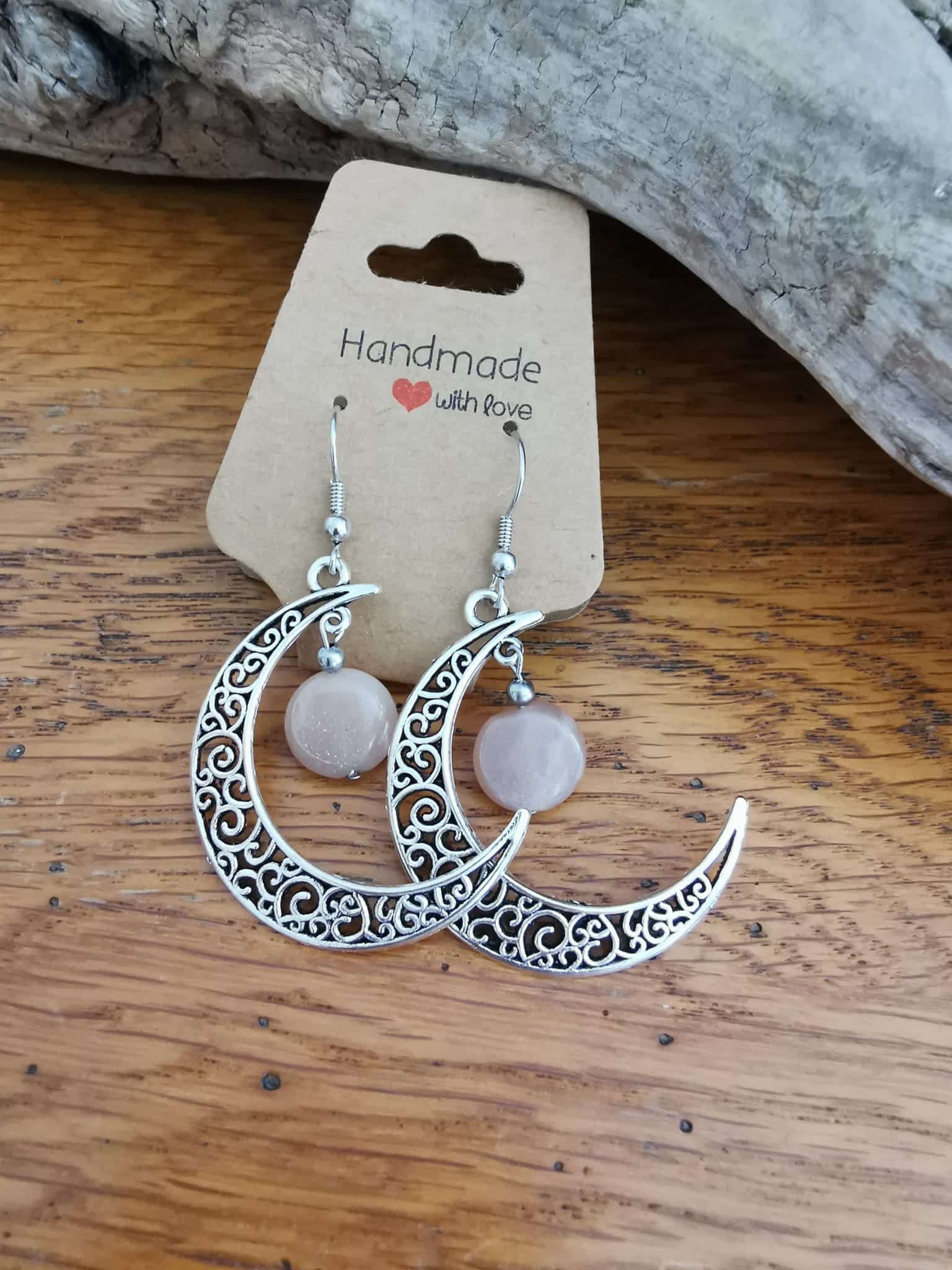 Boucles D’Oreilles Lune en Pierre de Lune Rose ( Adulaire ) avec de jolies paillettes de Feldspath.
