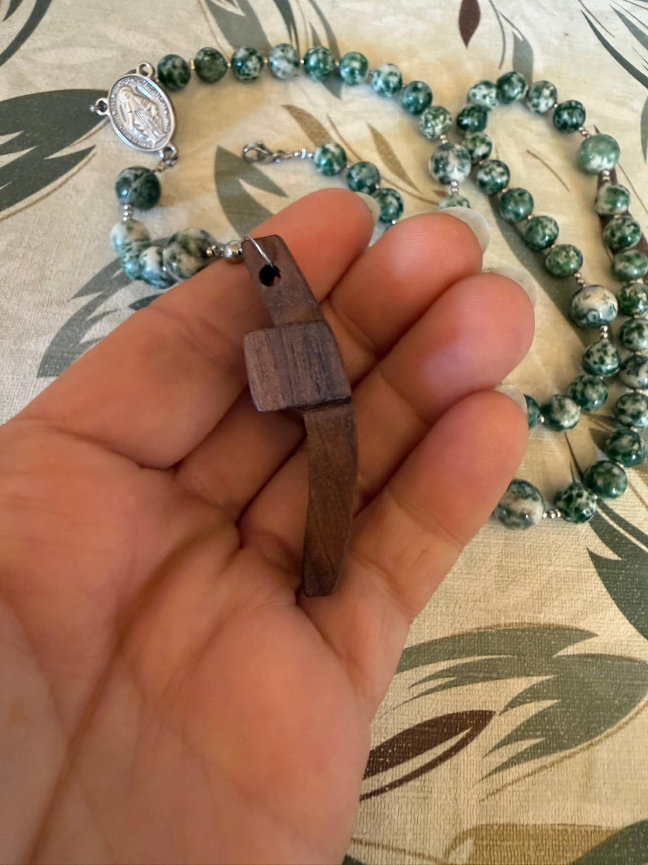 Le chapelet est muni d’un fermoir mousqueton, en acier inoxydable pour que, vous puissiez mettre le chapelet autour de vôtre cou.